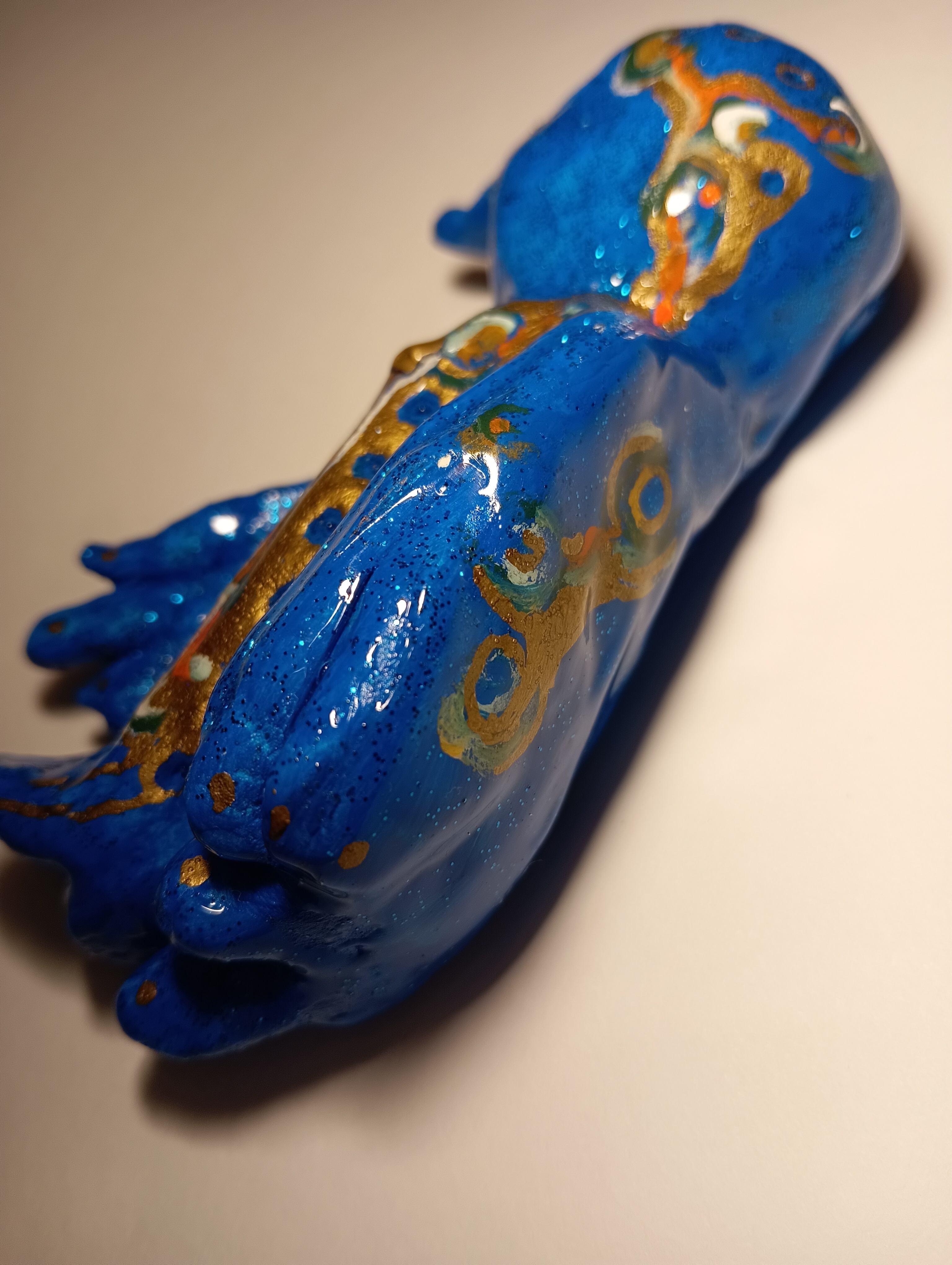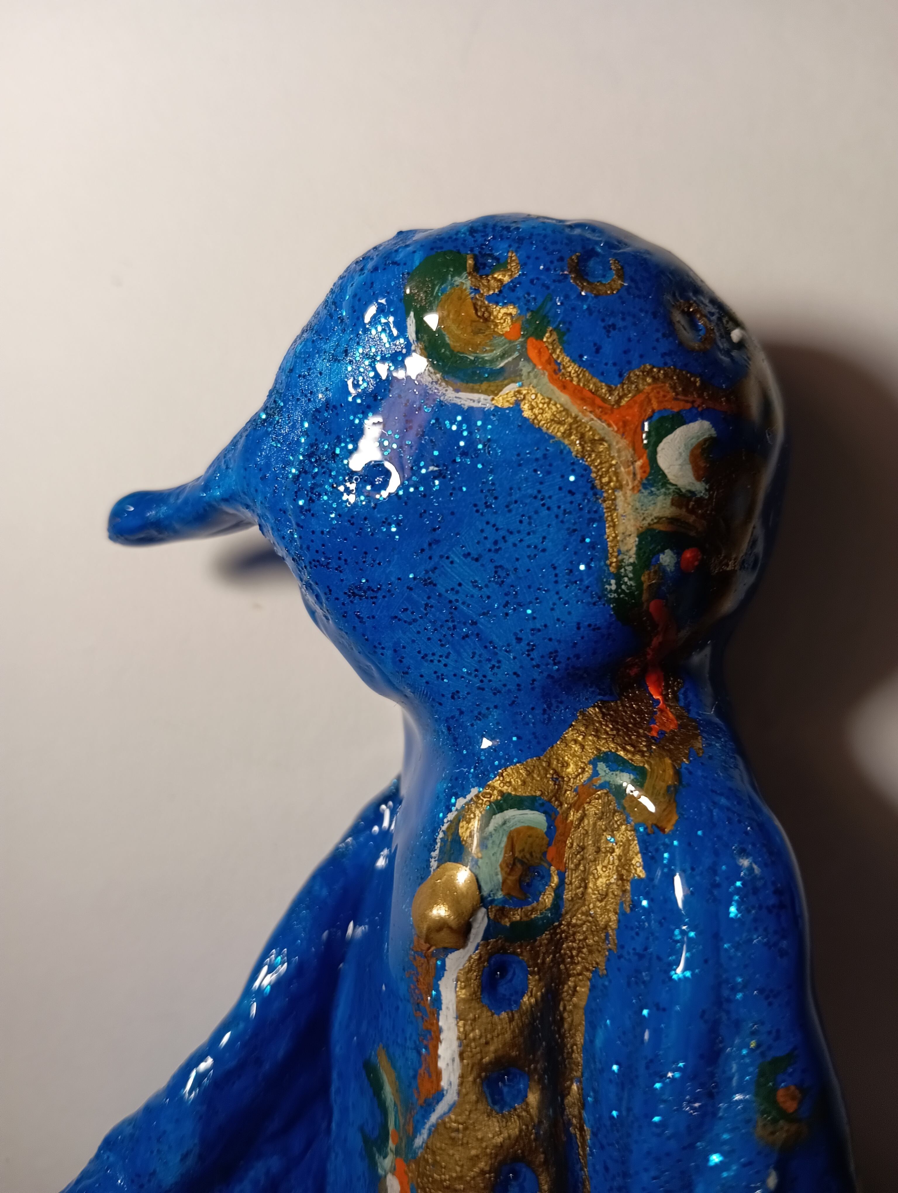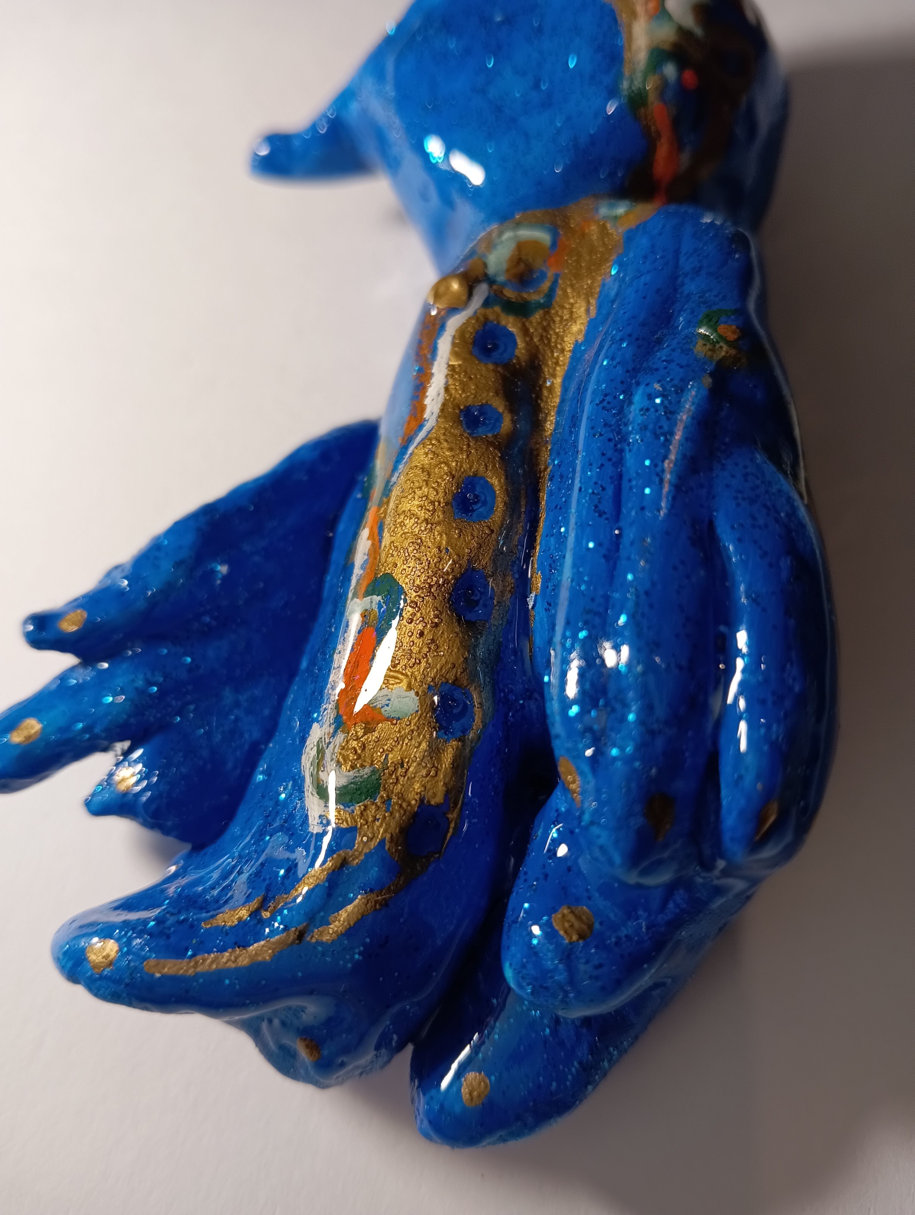 It was sculpted from stone powder clay, painted with acrylic paint, glitter, and gold ink, and finished with a resin coating.