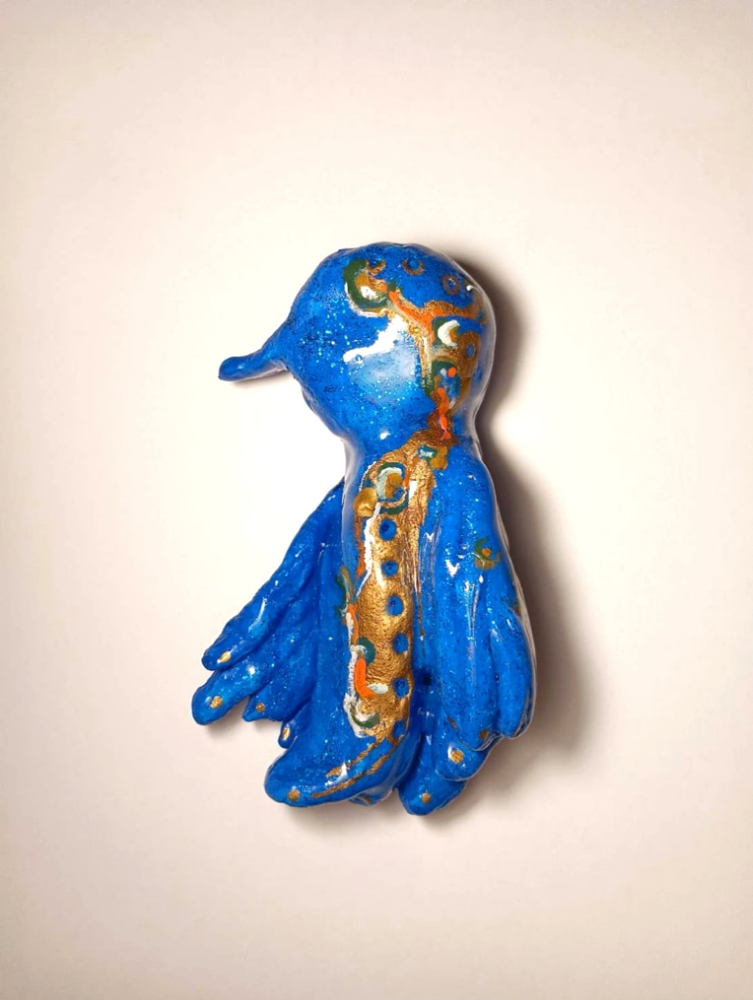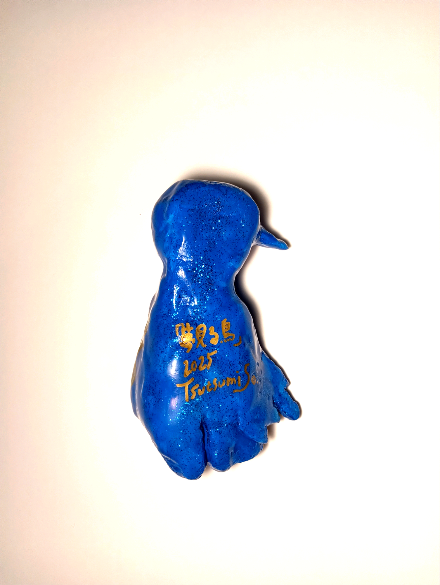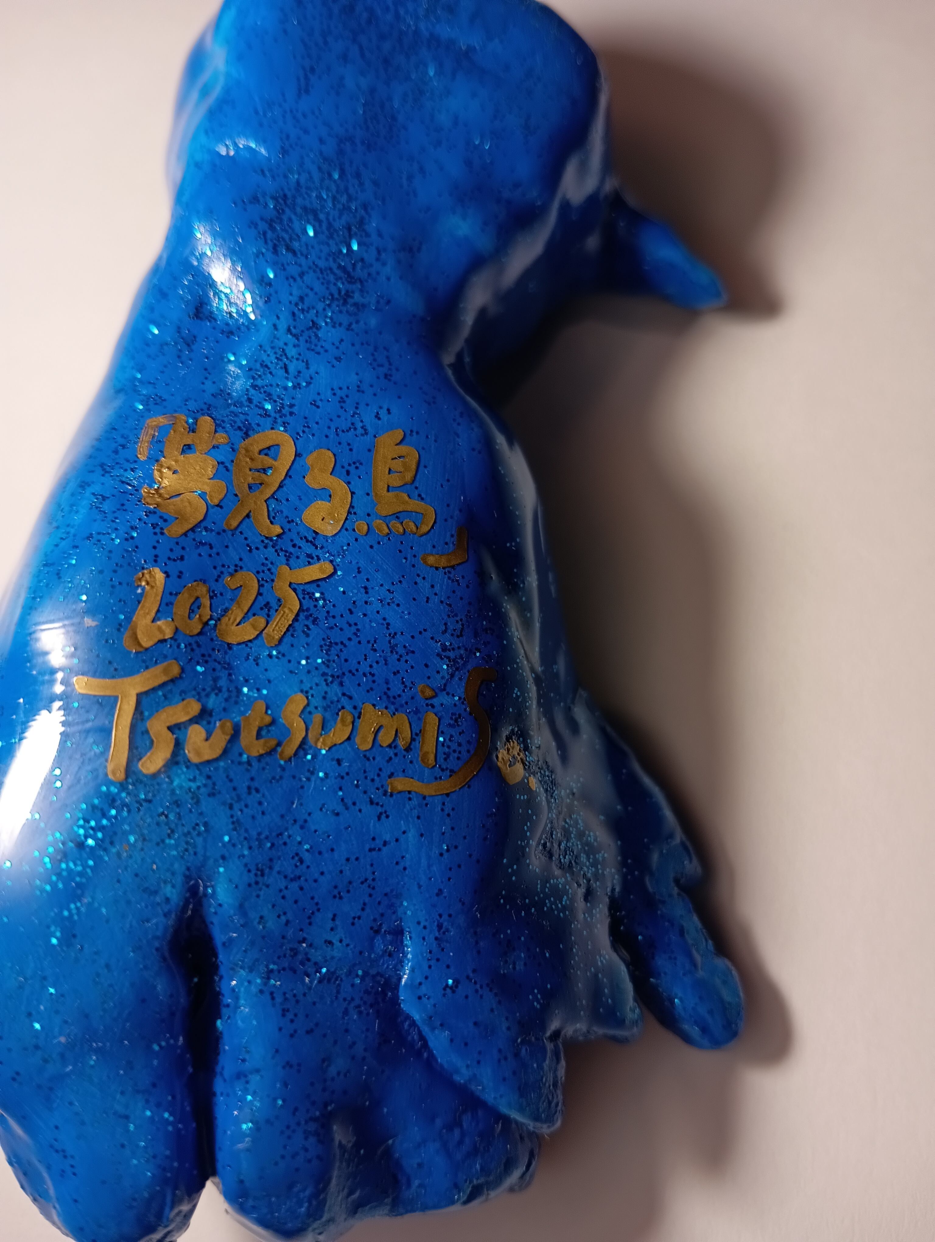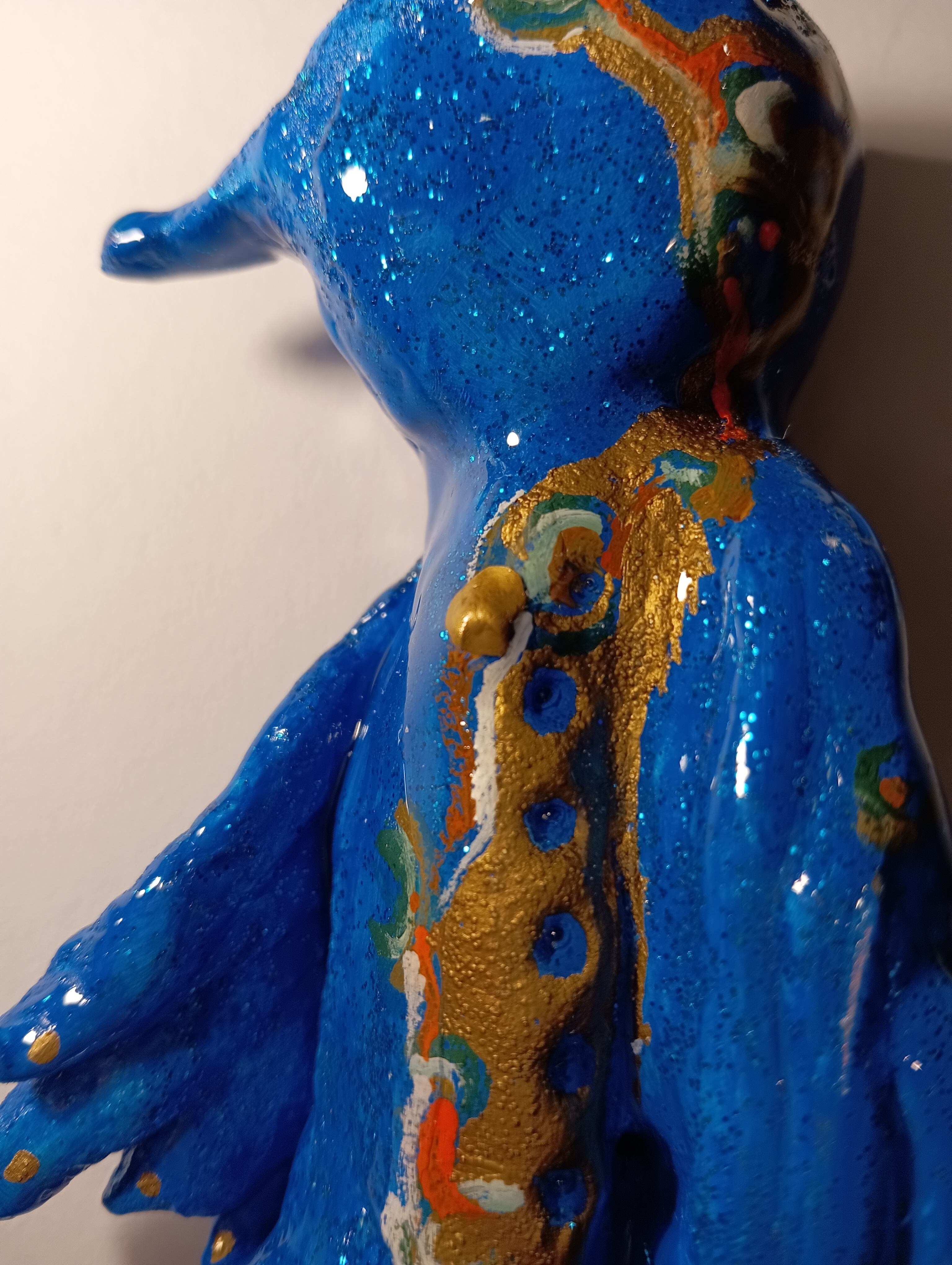 It was sculpted from stone powder clay, painted with acrylic paint, glitter, and gold ink, and finished with a resin coating.