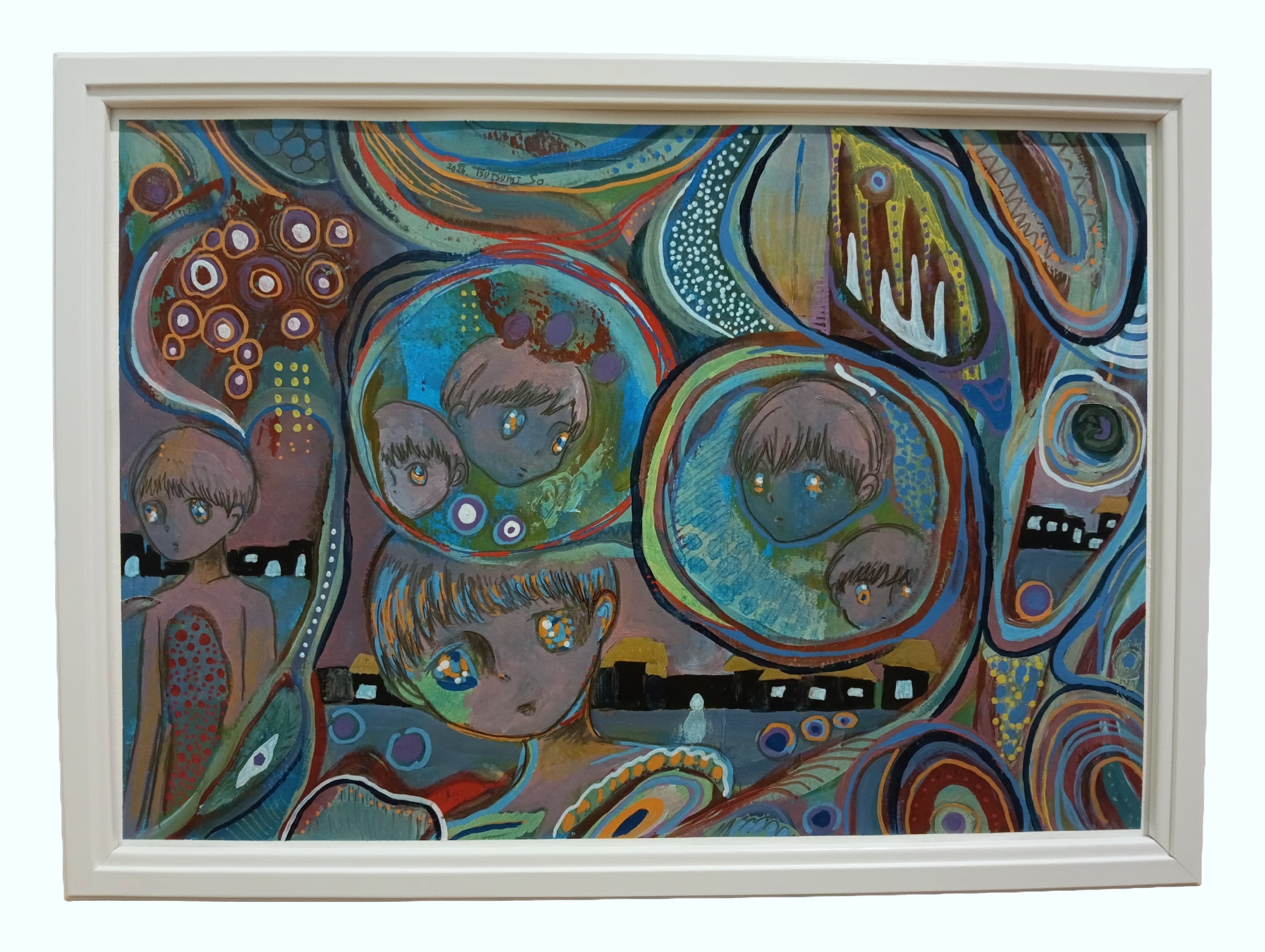 素材 紙にアクリル絵の具、カラーペン、マーカーペン、鉛筆、色鉛筆